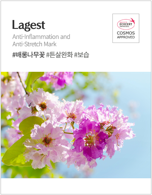 - 보습히알루론산은 사람의 몸 속에 존재하는 다당류의 일종으로 피부장벽의 기능 조절과 보습작용이 있어 피부 재생 및 항노화 효능이 뛰어난 것으로 알려져 있습니다. 배롱나무꽃추출물은 세포실험에서 히알루론산 증가효능을 보여 Lagest를 통한 피부 보습 효능을 기대할 수 있습니다.