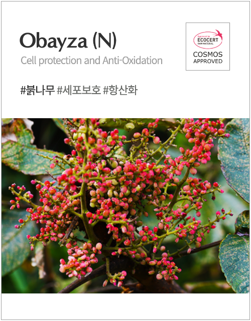 붉나무 추출물은 PPD로부터 두피를 보호하여 염색약 및 각종 화학물질로부터 두피를 좀 더 안전하고 건강하게 유지할 수 있게 도와줍니다. - Obayza (N)는 세포실험에서 PPD에 의한 독성을 억제하는 효과를 보였으며, PPD에 의한 활성산소 억제 효능을 보였습니다.