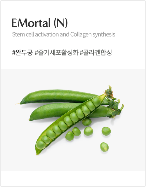 - 펩타이드 주름 개선EMortal (N)은 콜라겐 합성에 효과가 있는 완두콩을 펩타이드화하여 피부 침투력을 증가시킴으로써 보다 효과적인 주름 개선을 위해 만들어진 제품입니다.