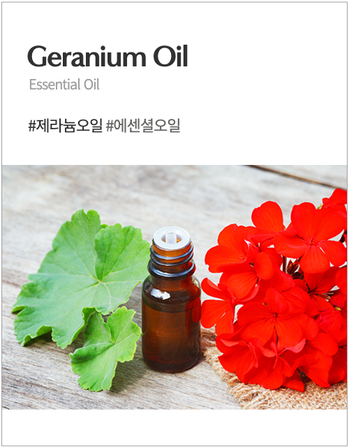 - Geranium Oil은 제라늄 꽃과 잎에서 증기 증류법으로 추출한 에센셜 오일입니다.