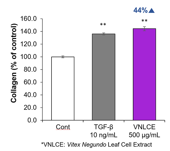 항노화VitexCell (L)의 바이텍스 캘러스(VNLCE)를 섬유아세포(Fibroblast)에 처리 하였을 때 콜라겐의 합성이 44% 증가하는 것을 확인 하였습니다.