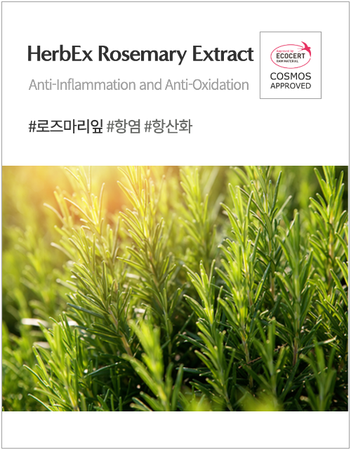 - HerbEx Rosemary Extract는 푸른 잎과 특유의 향으로 많은 사람들의 사랑을 받는 로즈마리 추출물을 포함하는 다기능성 원료입니다.