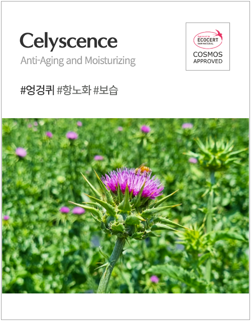 - Celyscence는 엉겅퀴꽃 추출물을 이용한 항노화, 보습, 미백 전용 복합원료입니다.