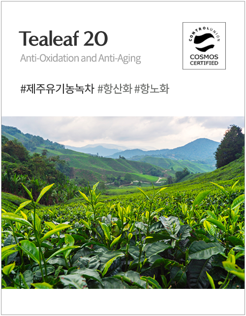 - Tealeaf 20은 화장품에 적용 가능하게 분쇄한 녹차잎 파우더로서 제형에 시각적인 효과를 나타낼 수 있을 뿐만 아니라 녹차잎에 함유된 여러 유익한 성분들의 작용으로 피부 건강에 도움을 줄 수 있는 제품입니다.